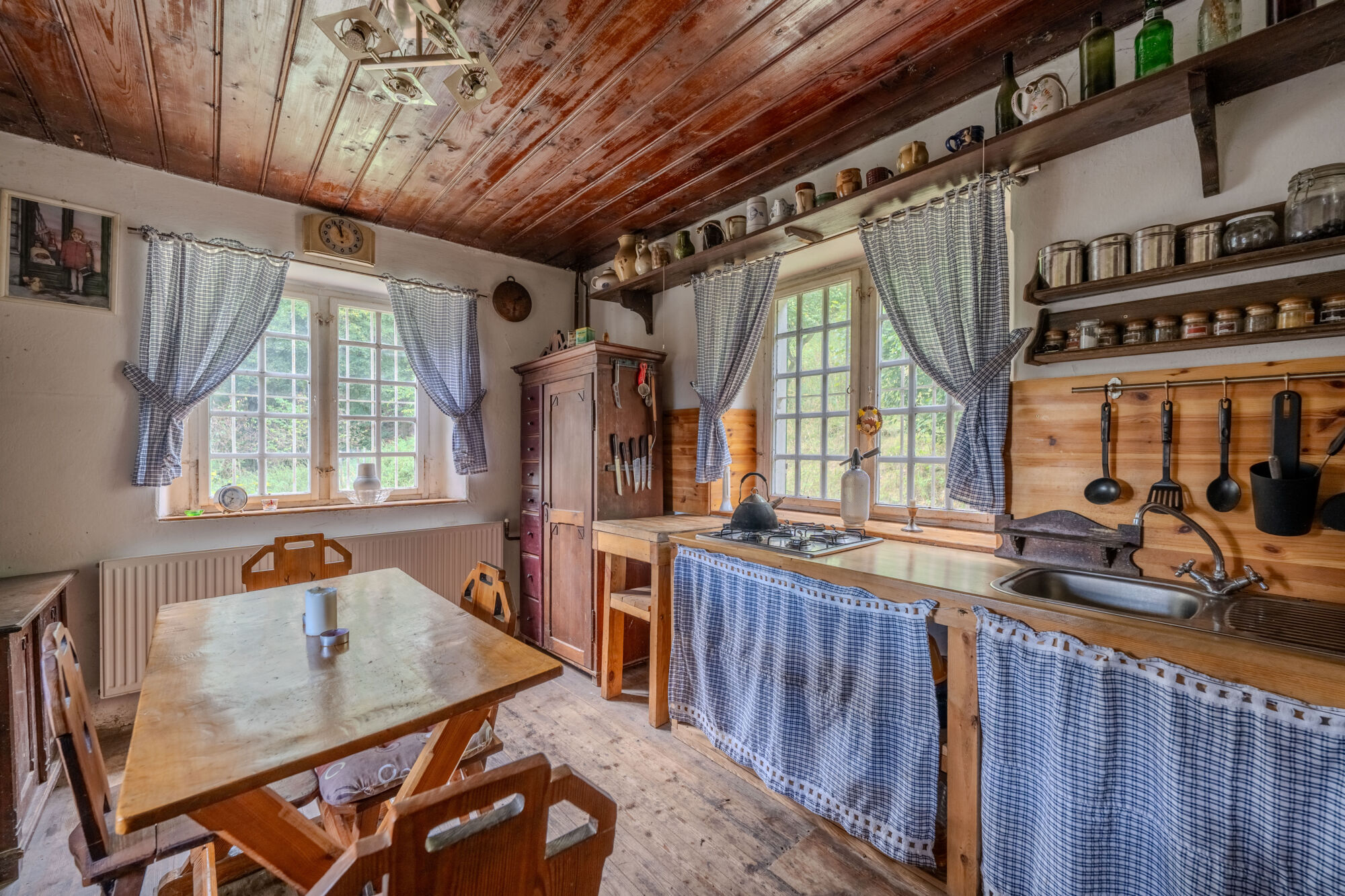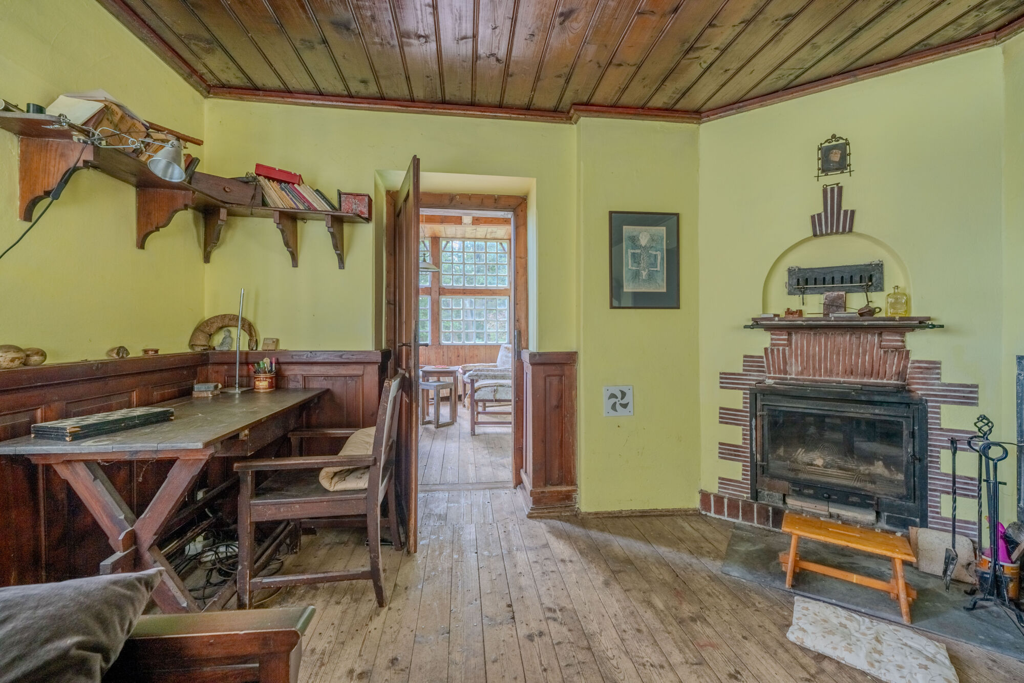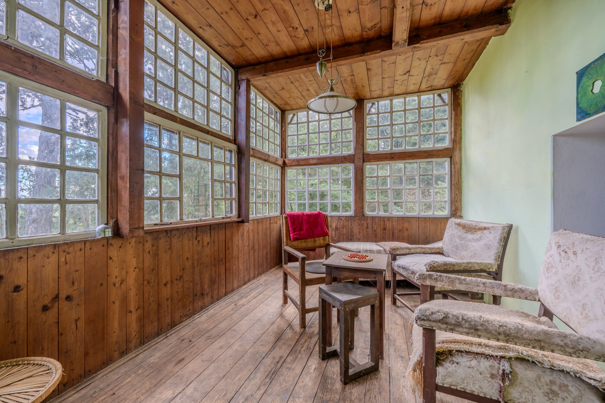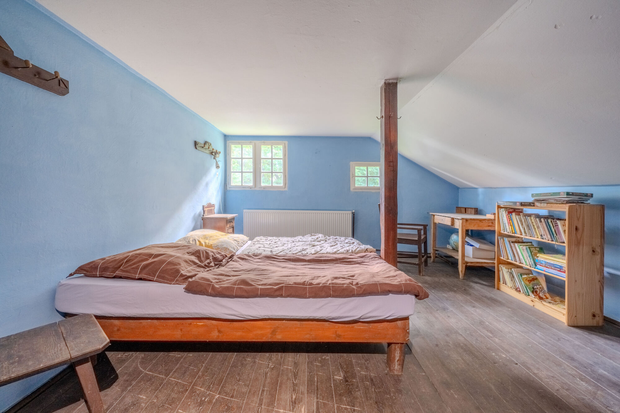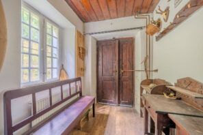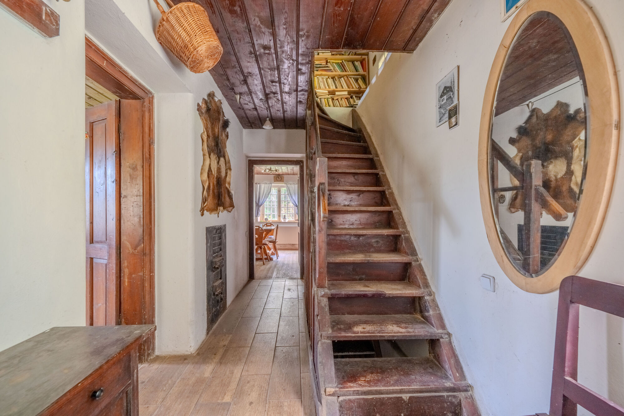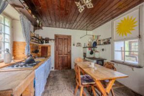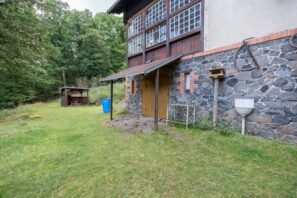 🏡 Samotný dům o zastavěné ploše 78 m² má tři podlaží. V suterénu se nachází prostorná koupelna s toaletou a kamny na tuhá paliva a dále pak dílna. V přízemí je k dispozici kuchyně s kachlovými kamny, útulný obývací pokoj s krbem a prosklená zimní zahrada s výhledem do okolí. Podkroví nabízí tři ložnice a menší pokoj, díky čemuž je prostor dostatečný i pro rodinné rekreační využití. Dům si uchoval původní historické prvky a postupné úpravy byly vedeny s ohledem na zachování autentického rázu.